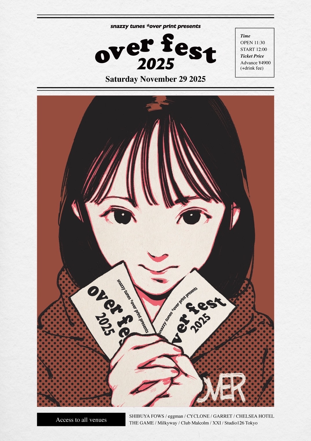『over fest』は、ファッションブランド・over printとロックイベント・SNAZZY TUNESが共同で開催しているロックサーキットイベント。初開催となった昨年の下北沢から場所を移し、2025年は渋谷FOWS、eggman、CYCLONE、GARRET、CHELSEA HOTEL、THE GAME、Milkyway、Club Malcolm、XXI、Studio126 Tokyoの計10会場で開催。さらに、当日はインフルエンサーのなえなのがover print POP UP STOREとともに、「なえなのCONCEPT STORE」をイベント内でオープンすることも決定している。