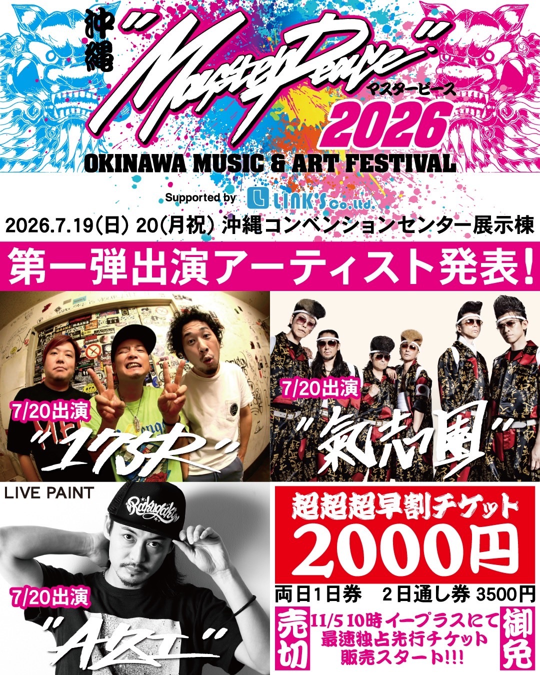 今回で3回目となる『MasterPeace MUSIC & ART FESTIVAL』が2026年7月19日(日)、20日(月・祝)に沖縄コンベンションセンター展示棟にて開催されることが発表された。また第一弾アーティストとして、175R、気志團、そしてライブペインティングのAZIが発表された。