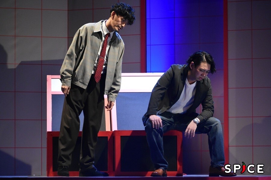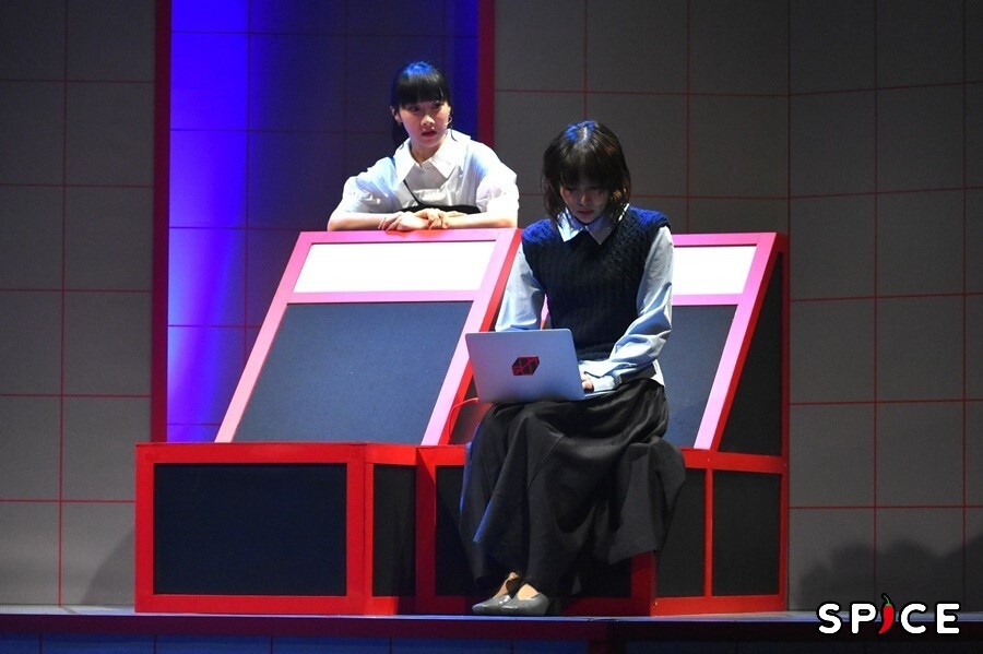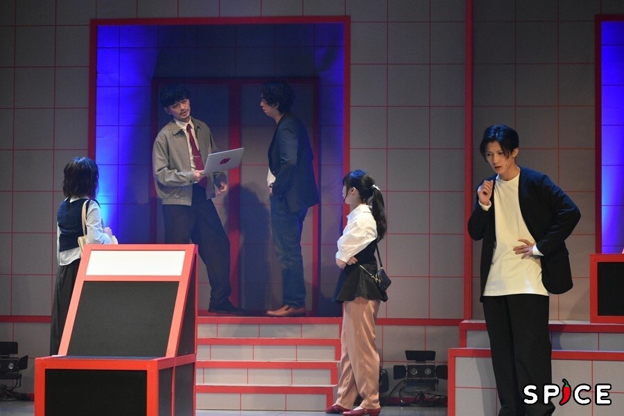 白の壁に、赤色がよく映えた舞台セット。VRシステムを模した舞台装置が、象徴的に鎮座している。無機質なようで、血が通っているような。もしかしたら、そんなメッセージが込められているのかと想像を巡らせながら、これから体験する未知のオリジナルストーリーに期待が膨らむ。