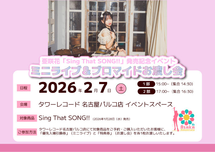 そして『Sing That SONG!!』の発売を記念したリリースイベントが決定。ネットサイン会や東京・名古屋でのミニライブなどが実施される。『Sing That SONG!!』を予約・購入することで参加できる。詳細は公式HPにて確認してほしい。