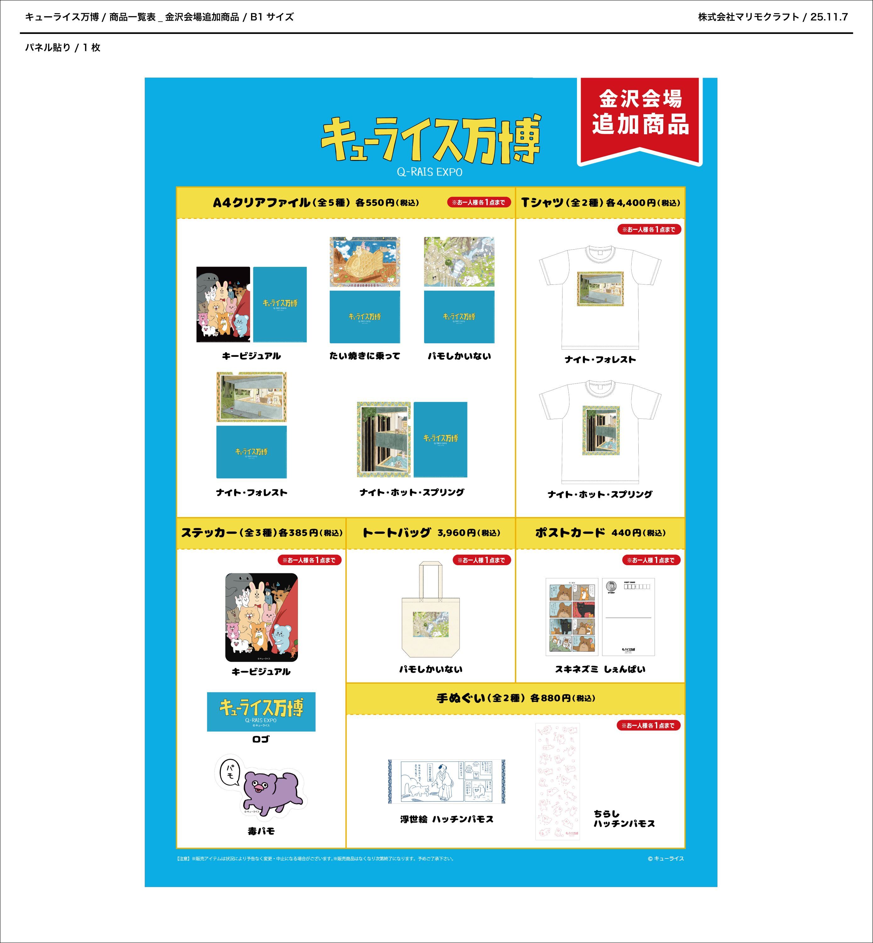 会場ではA4クリアファイルやトートバッグ、Tシャツ、ステッカーほか記念グッズも多数販売。金沢会場からはハッチンパモス 刺繍パーカーや新登場したハッチンパモス 毒パモス刺繍ニットキャップなども新登場した。税込5,500円以上購入すると、数量限定でキューライスの手書きイラストがプレゼントされる。