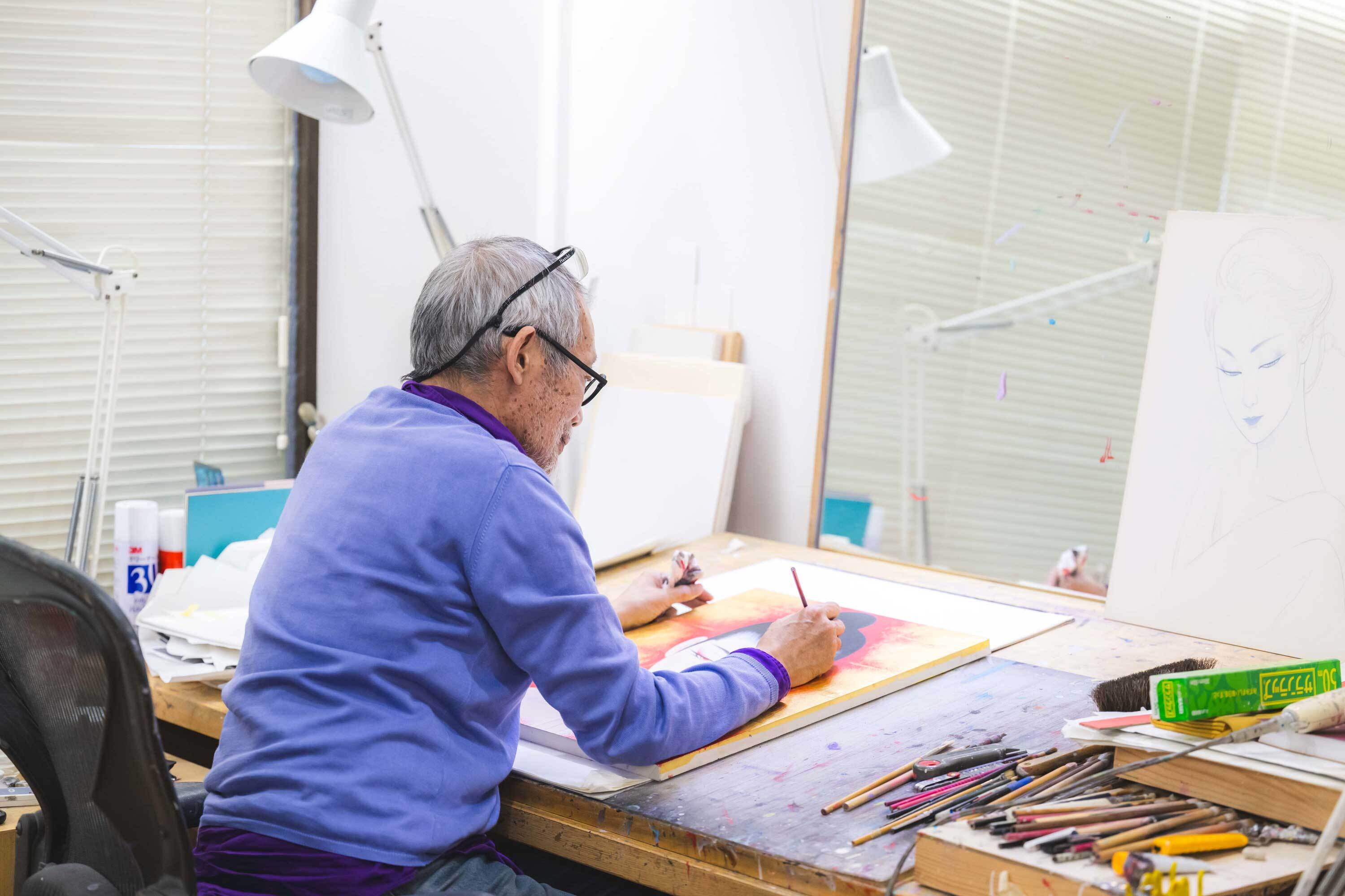 1987年にノエビア化粧品の広告で注目を集めて以降、美人画の第一人者として国内外で高い評価を受けている鶴田一郎。幼少期から絵一筋で人生を重ね、来年画業50周年を迎える。本展覧会の会場である天保山ギャラリーと鶴田の交流は、30年以上の長きにわたる。合同展から始まり、1993年からは定期的に鶴田の個展を開催するようになったことから、鶴田の「大阪の聖地」と呼ばれている。今回は、移転して約1年の新しい鶴田一郎事務所(アトリエ、ギャラリー併設)にて、本展覧会の裏側や、日ごろの創作活動について、美人画への想いや今後の展望まで、鶴田本人と鶴田を近くで支えるスタッフも含めてじっくり話を訊いた。齢71歳、画業49年を迎えた鶴田の、今もなお鮮やかな、絵に対する情熱と好奇心が伝わる時間となった。