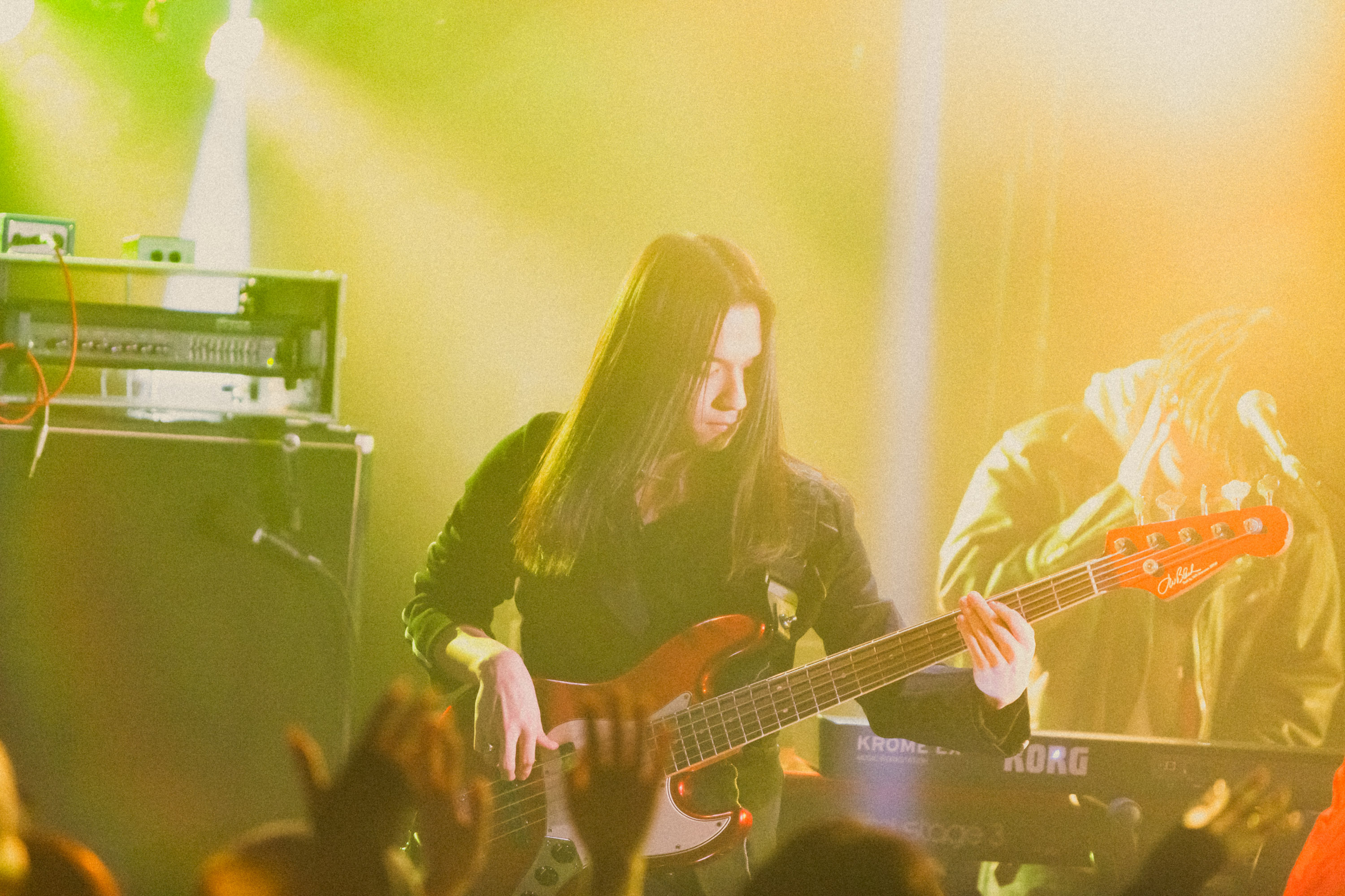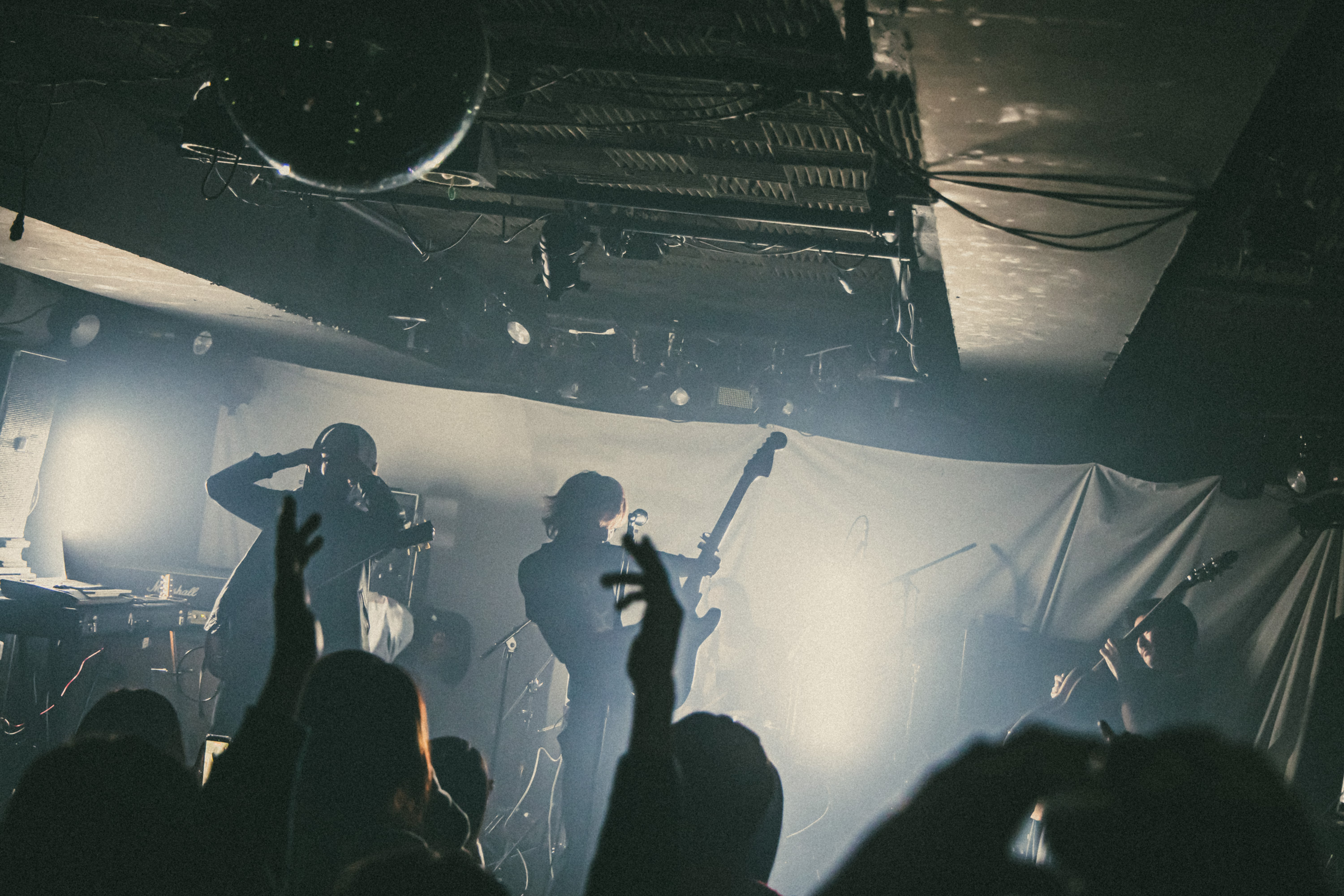 赤い髪がトレードマークのRyoseiが「始めるわ、よろしく」とラフに放つと暗転、ステージのLEDライトが煌々と灯る。やがてライトが消えて、一面にRyomaによる映像が映し出された。スタイリッシュな雰囲気に包まれるとライブは「Lonely」から幕を開けた。ボーカルエフェクトがかかったRyoseiの歌声が浮遊感を誘う。上下左右に流れる映像の視覚効果も相まって、じわじわと彼らが作り出す没入空間へと引き込まれていく。Ryoseiは「一緒に遊びませんかー! どうしますかー?」と笑顔でフロアに呼びかけ、「Radio before school」、「Natsu no hando」を連続で披露。心地良いアンサンブルと上昇感、跳ねるビート、歪みギター、何よりも心底楽しそうなメンバーたち。音楽を存分に味わえる、最高の環境が用意された。となればあとは楽しむだけ。「Let’s go!」とRyoseiが叫んだのを合図に自然にフロアの拳があがる。