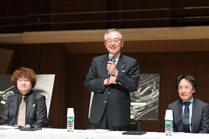 中央)宮内義彦・新日本フィルハーモニー交響楽団理事長