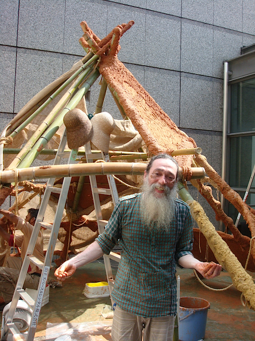 今回出品されるのは豊田の竹を使ったインスタレーション作品で、テントのように組んだ竹の土台に麻布を巻き、その上からチップ状にした再生パルプと恵那の土、糊を混ぜたものを塗り重ね、内部にはオブジェや楽器などを置くという。楽器は陶製の壺のような形状をしたアフリカ発祥の民族楽器で、この「ウドゥドラム」や瀬戸の粘土で焼いたオブジェのパーツなどを瀬戸で制作したのだ。