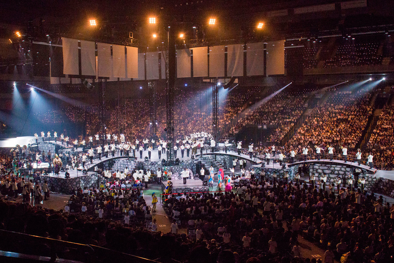 会場に入って目に飛び込んできたのは、これまで観たこともない形状をした巨大な可動式ステージだ。360度から楽しめるというその斬新さに度肝を抜かれた。これは、北京オリンピックや世界的人気ミュージシャンの舞台装置を手がけるレイ・ウィンクラー氏(Stufish Entertainment Architects)によるもの。