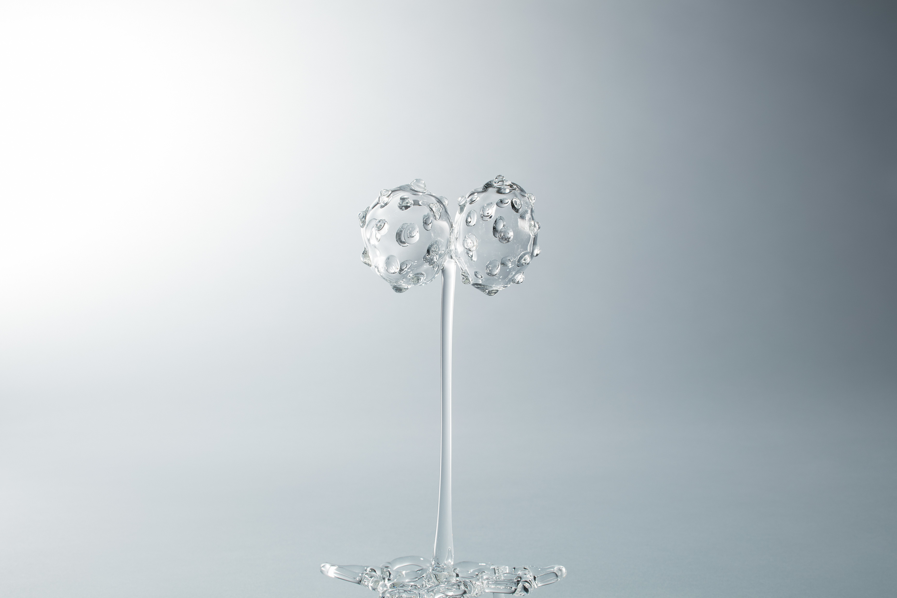 青木美歌は、粘菌、バクテリア、ウイルス、細胞といった目に見えない「生命の有りよう」をテーマに、ガラスを素材にした作品を発表してきたアーティスト。「バーナーワーク」という技法により、1 つ1 つ緻密に作られた透明なガラスからは、あたかも生命が宿っているかのようなパワーを感じることができる。